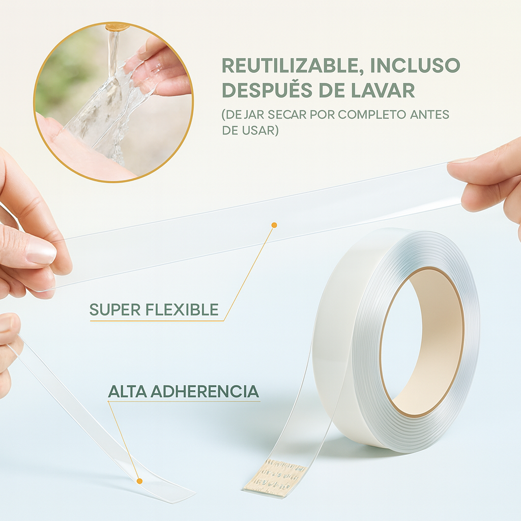 La Cinta Multifunción de Doble Contacto puede ser usada en varias formas que adoptan gracias a su nanotecnología. Es más conveniente que las formas tradicionales de fijar objetos en la pared, el techo y el suelo.